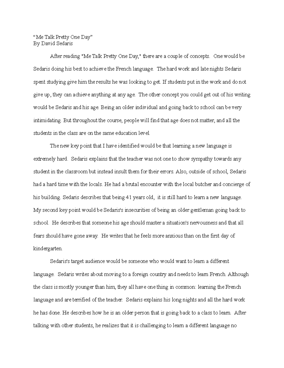When you use sources in your paper you will need to either quote paraphrase or summarize the information. In the article Me Talk Pretty One Day by David Sedaris Sedaris talks about his time in France and how he was taking a French class there to enhance his language skills. Sedaris describes how anxious and insecure he had felt about attending school with younger students at his age.